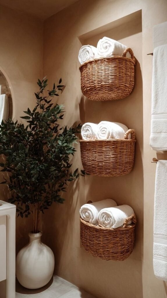 By combining elegant rolled towels with wall-mounted wicker baskets, you instantly create a calm, spa-like feeling—even in the smallest bathroom. These hanging baskets don’t just look beautiful; they free up floor space, keep towels within reach, and add a warm, natural texture that makes the room feel intentional and serene.